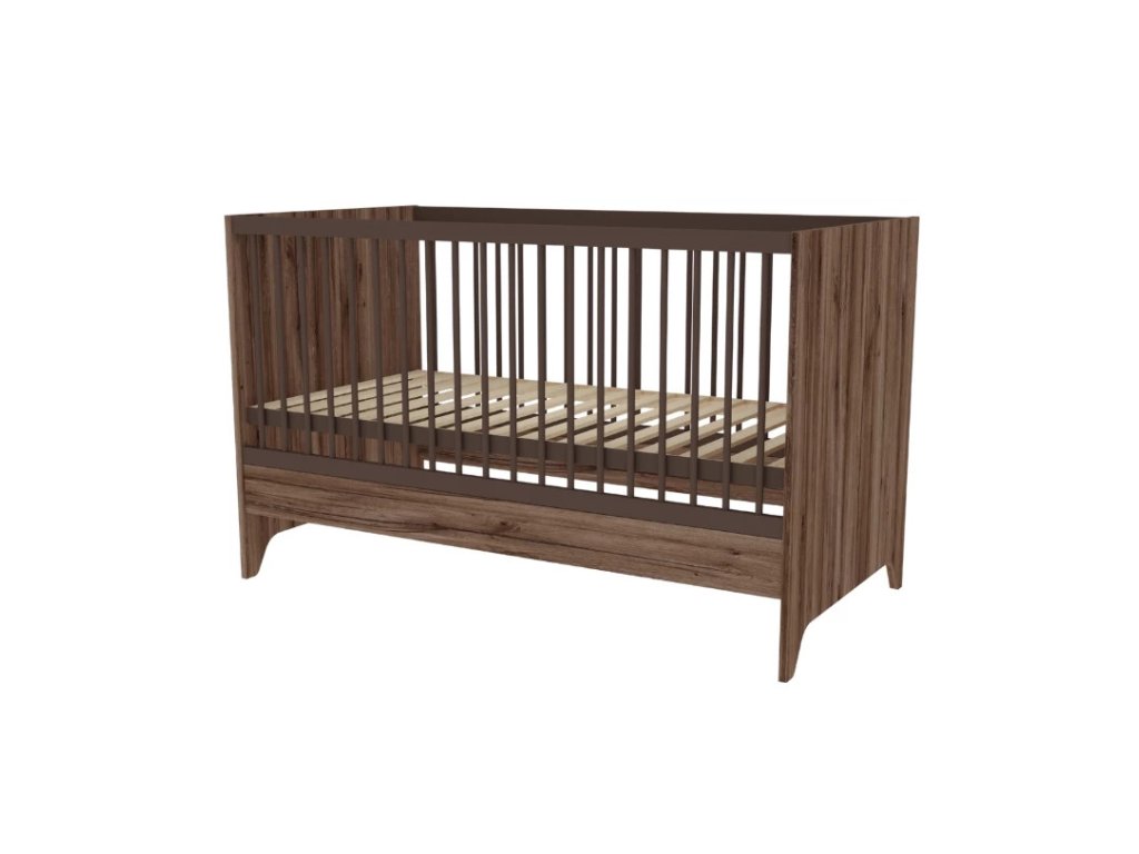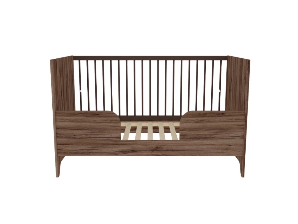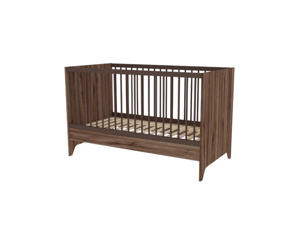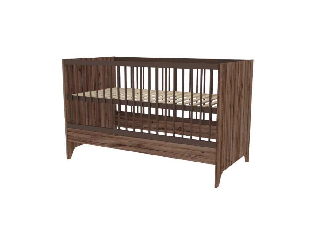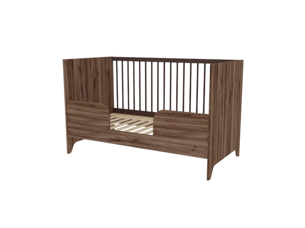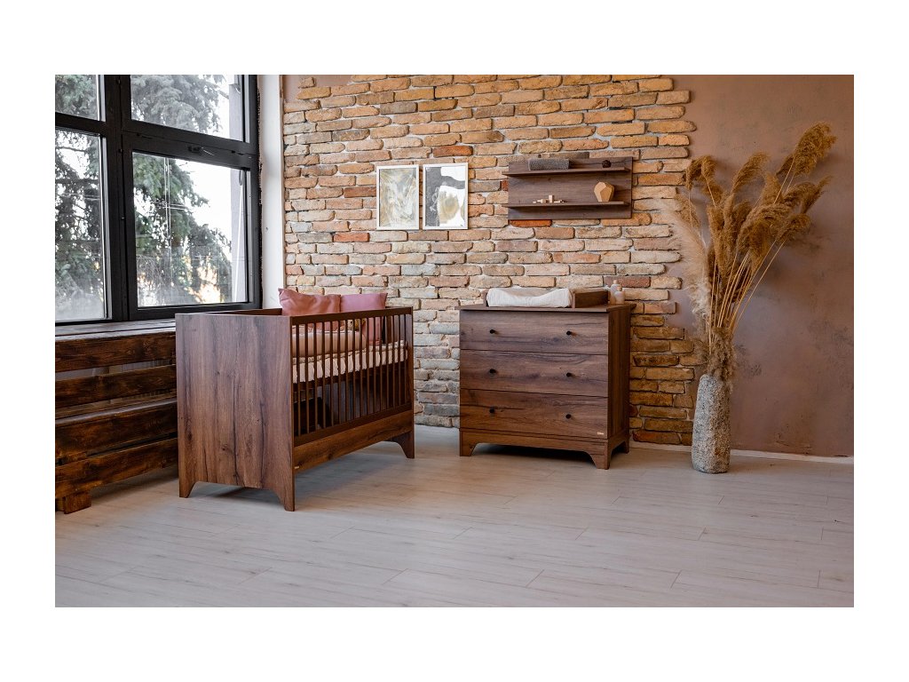 Dětská postýlka Nest Walnut 140x70cm je variabilní částí moderního dětského pokoje, která poslouží dítěti po dlouhou dobu. Povrchová úprava v odstínu tmavého ořechu je zdobena speciálním černým žilkováním, které dodává nábytku přírodní vzhled a charakter.