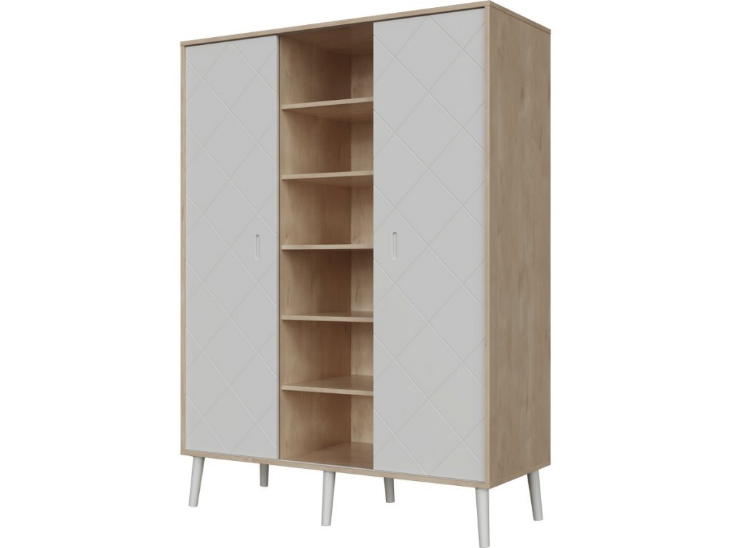 Provedení: Skříň lze sestavit v policovém nebo závěsném provedení. Levá strana skříně obsahuje 1 polici a 2 šatní tyče, střední otevřená část obsahuje 5 poliček, zatímco pravá strana skříně obsahuje 4 police.