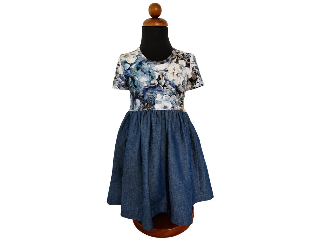 Elegantní dívčí šatičky s krátkými rukávky. Živůtek je vyrobený z jemného bavlněného úpetu s potiskem hortenzií, sukýnka je z bavlněné džínoviny.