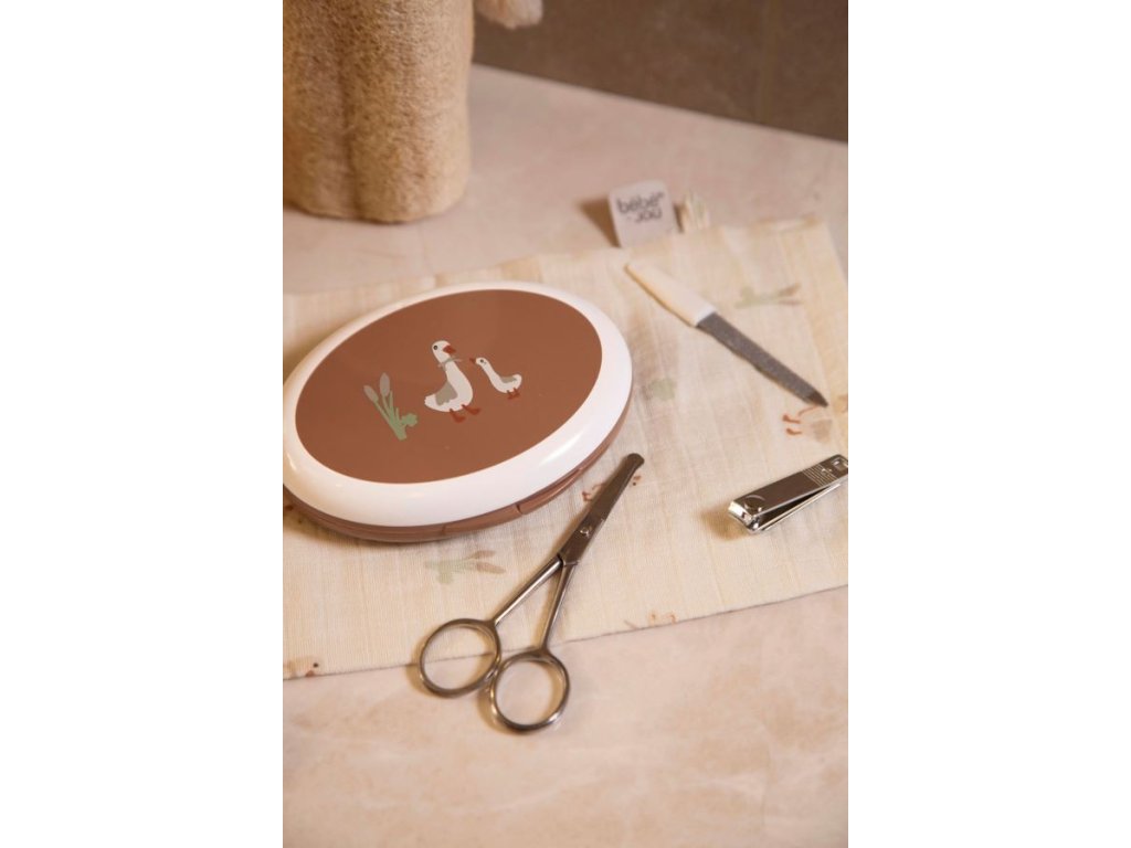 Manikůra obsahuje nůžky se zakulacenými konci, pilníček na nehty a také kleštičky na nehty. Vše je vyrobeno z nerezavějící ušlechtilé oceli. Krabička chrání před prachem a pomáhá udržovat manikuru v čistotě. Ale i přesto před každým použitím jednotlivé nástroje pečlivě očistěte a u novorozenců i desinfikujte roztokem lihu.