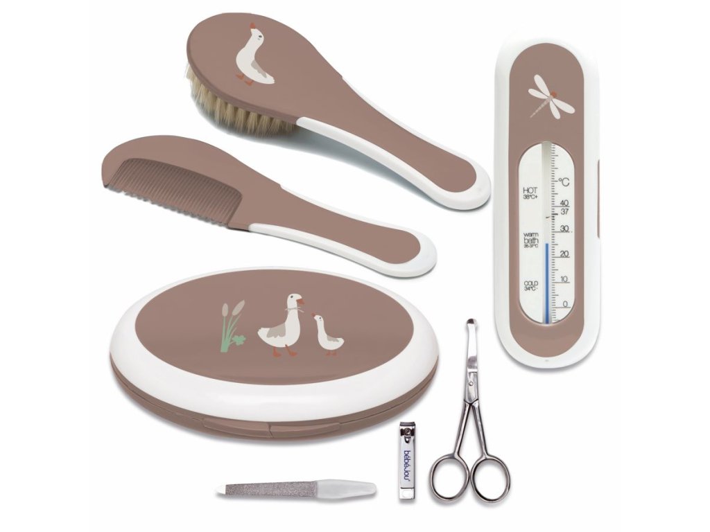 Roztomilá čtyřdílná dárková sada potěší novopečené rodiče hned několikrát. Poprvé, když ji obdrží a pak pokaždé, když ji budou používat. Není to jenom krásný dárek, ale také velice praktická, krásně zabalená sada. Obsahuje koupací teploměr, manikůru, hřeben a kartáč.
