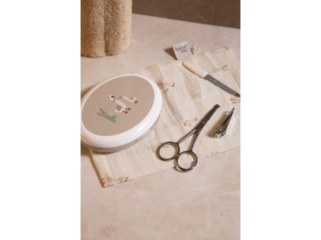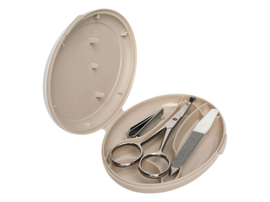 Manikůra obsahuje nůžky se zakulacenými konci, pilníček na nehty a také kleštičky na nehty. Vše je vyrobeno z nerezavějící ušlechtilé oceli. Krabička chrání před prachem a pomáhá udržovat manikuru v čistotě. Ale i přesto před každým použitím jednotlivé nástroje pečlivě očistěte a u novorozenců i desinfikujte roztokem lihu.