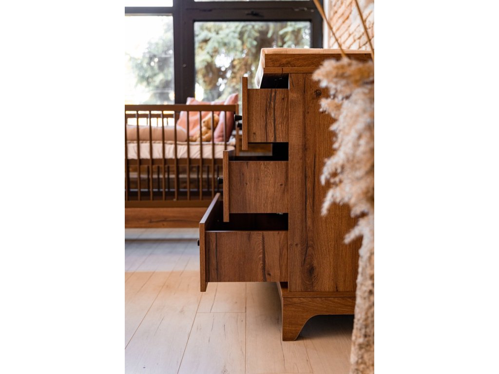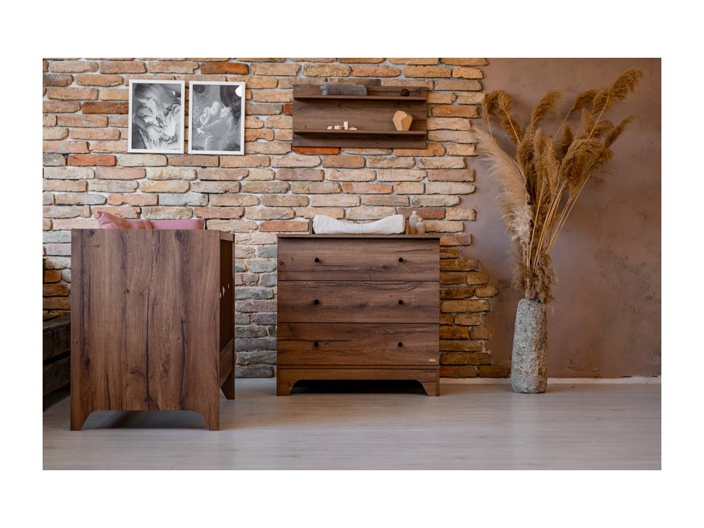 Pokoj pro novorozence se prakticky neobejde bez komody a přebalovacího pultu. Zásuvková komoda Nest Walnut v odstínu tmavého ořechu s černými úchytkami, které dodává nábytku osobitý vzhled, tvoří takový kousek nábytku, který po doplnění o přebalovací nástavec, pokrývá oba tyto požadavky. Je navržena tak, aby se vešla do relativně malého prostoru, a přesto nabídla co největší pomoc novým rodičům.