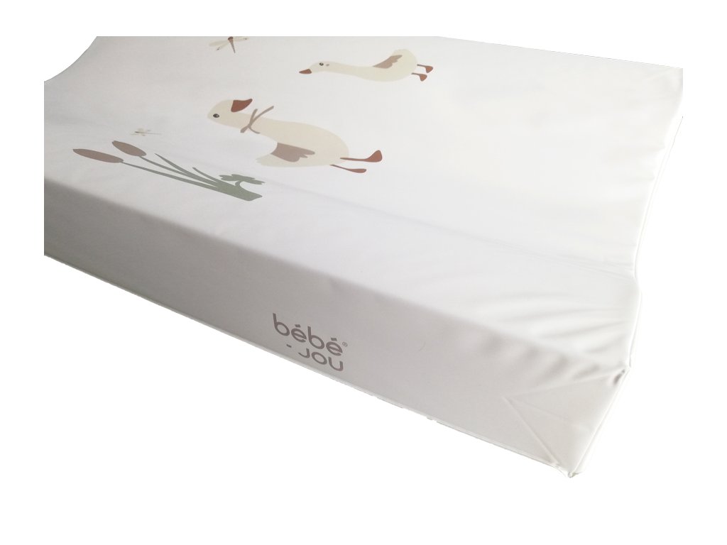 Přebalovací podložka Bébé-jou má pohodlnou velikost. Je vyrobena z vysoce kvalitní polyetherové PU pěny s dlouhou životností. Tyto speciální vlastnosti zaručují, že je hlavička i krček dítěte obzvlášť dobře podepřen. Zaoblený tvar zajistí, že dítě leží pohodlně a bezpečné ve středu. Fólie a prodyšná pěna jsou vyrobeny z ekologicky šetrných materiálů a jsou bez škodlivých látek (Ftalátů). Certifikované Oeko Tex.
