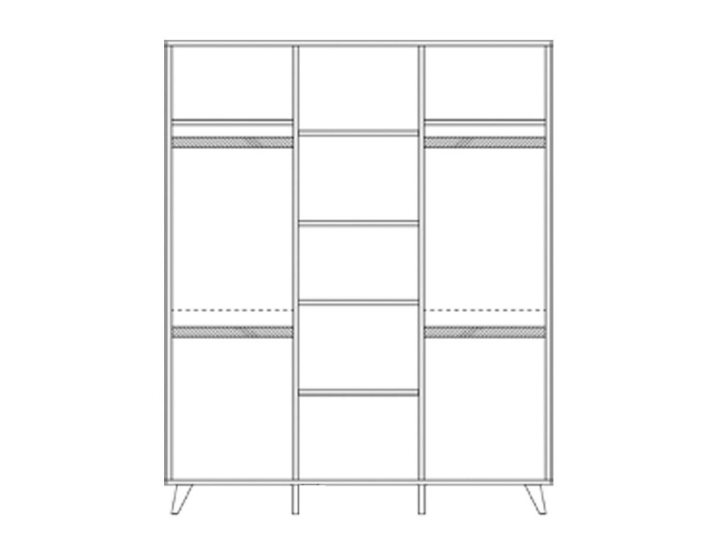 - Vybaveno 4 nastavitelnými policemi ve středové části, 4 šatními tyčemi a 2 pevnými policemi v bočních částech, podrobněji viz schéma vnitřního uspořádání skříně.