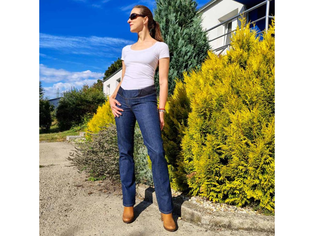 Těhotenské bavlněné džíny středně modré barvy. Přední díl s falešným zapínáním. Zadní díl s páskem s poutky, sedlem a nakládanými kapsami s nýtky a kontrastním prošíváním. Boční šev kalhot je rovněž prošitý. Pas je ukončený pohodlným úpletovým dílem s nastavitelným obvodem pomocí dírkové gumy. Kalhoty tak můžete nosit i bez bříška.