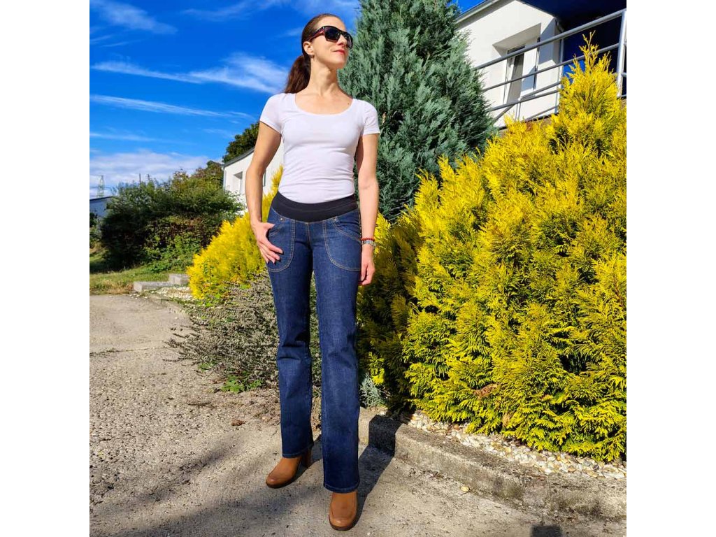Těhotenské bavlněné džíny středně modré barvy. Přední díl s nakládanými kapsami s nýtky a kontrastním prošíváním. Zadní díl s páskem s poutky a sedlem s kontrastním prošíváním. Boční šev kalhot je rovněž prošitý. Pas je ukončený pohodlným úpletovým dílem s nastavitelným obvodem pomocí dírkové gumy. Kalhoty tak můžete nosit i bez bříška.