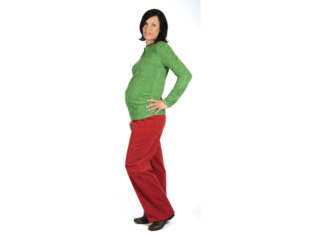 Velmi zajímavá těhotenská mikina áčkového střihu s kulatým výstřihem, kterým je provlečená ozdobná gumka s brzdičkou. Obléká se přes hlavu. Je řasená na bocích předního dílu. Dlouhý rukáv. Je ze smyčkového materiálu.