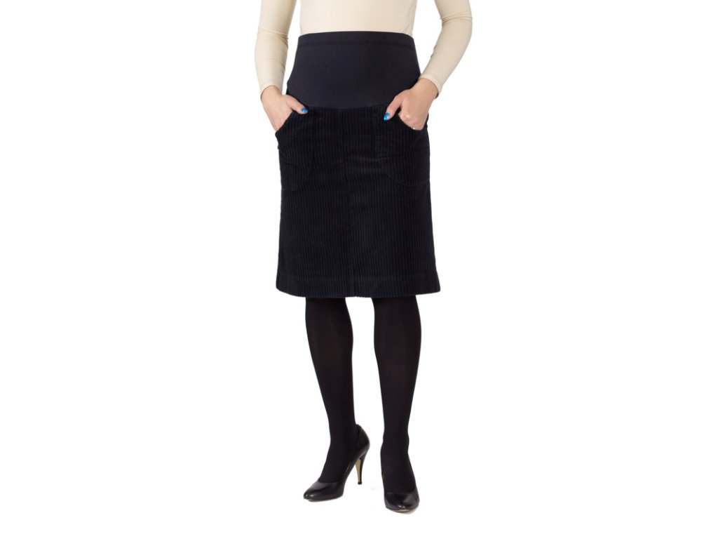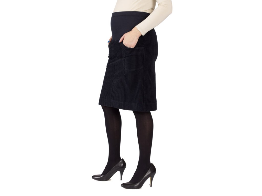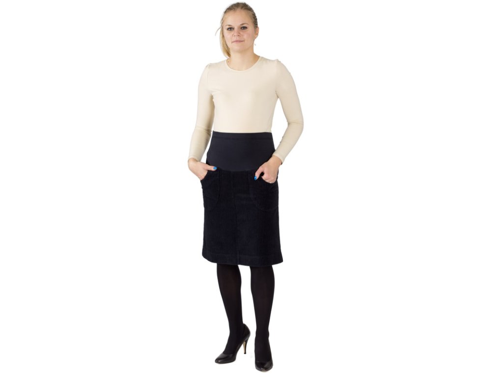 Velmi příjemná teplejší manšestrová těhotenská sukně s nakládanými kapsami na předním díle. Čtyřdílová sukně, přední díl se středovým švem a nakládanými kulatými kapsami, zadní díl se středovým švem. Záložka dolního kraje je 5 cm široká a ozdobně prošitá. V pase je všitý úplet s možností regulace obvodu pasu.